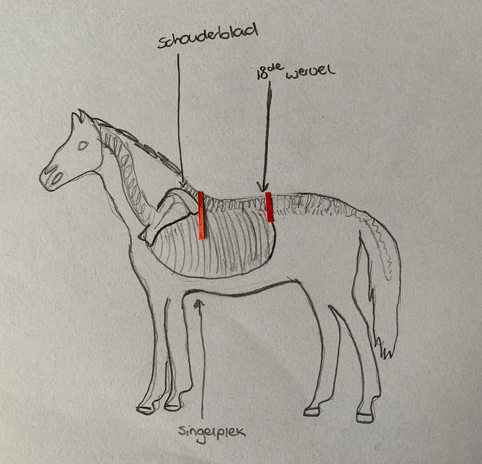 belangrijk dat het zadel geen druk uitoefent achter de 18de wervel. De 18de wervel is gemakkelijk te vinden, wanneer je de laatste rib naar boven toe volgt. Daarnaast moet het draagvlak achter de schouder liggen. Er mag namelijk geen druk op het schouderblad door het zadel ontstaan. Het zadel, beter gezegd het draagvlak, mag vanaf achter de schouder tot de 18de wervel lopen. Teken desnoods twee lijntjes met een krijtje achter het schouderblad en ter hoogte van de 18de wervel. Het draagvlak van het zadel moet tussen deze twee lijnen liggen.